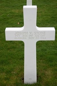 Pvt Joseph V. Stone had been overseas three months.Source of information: Astrid van Erp, www.wwiimemorial.com, www.archives.gov, www.newspapers.com - The Birmingham News Sun 10 June 1945, www.ancestry.com - 1930/1940, www.fold3.com - WWII Draft Card