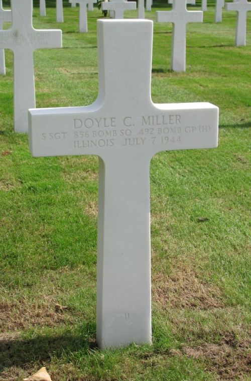 Doyle C. Miller entered the service on 16 October 1941 at Chicago, Illinois. He attended 4 years of high school and was a truckdriver at the time he enlisted.The airplane was shot down by enemy fighters over Bernburg in attempt to take out an aircraft manufacturing plant. Four of the men were killed while manning their posts. Some of the men were able to jump before the ship exploded. Others, like Frank Haag, were blown out. George Haag watched his brother's plane go down.