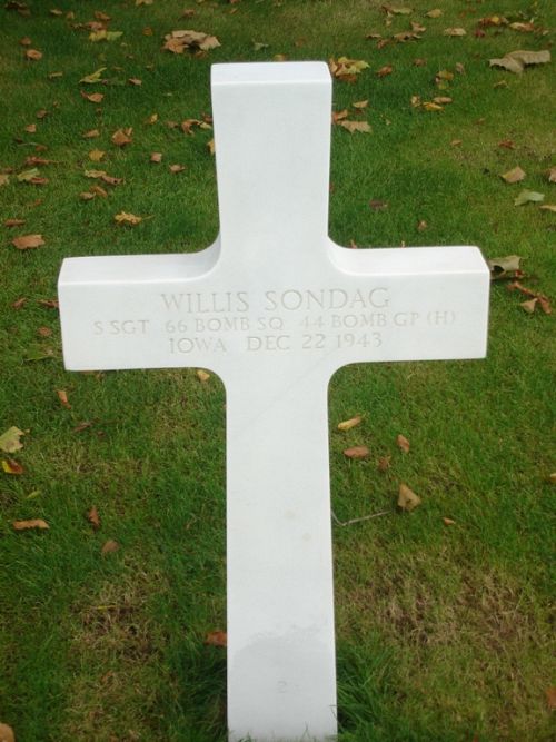 A/C 533 was reported as lagging in the rear of the formation, just after the target. Bomb doors were still open. Different crew members observed this A/C at various times between 1400 and 1431, and each one reports that it was losing altitude and lagging further behind but with all motors operating and apparently under control. A/C 548 was flying on the right wing and the pilot of this ship reports that he pulled up alongside A/C 533 to determine why they were not keeping up with the formation. The pilot of A/C 533 motioned for him to go ahead and catch the formation. At 1431, the tail gunner of A/C 548 saw the ship begin to spiral down below the clouds. No chutes were seen to open. It is not believed likely that any of the crew survived.S/Sgt Willis Sondag was initially buried at the cemetery of Den Ham on 27 December 1943.