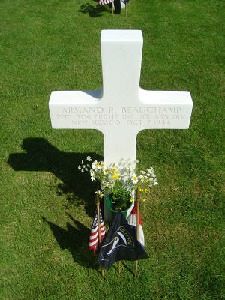 Pfc Armand R. Beauchamp graduated from Alamogordo High School in 1938 and from Harden-Simmons University, where he majored in history. He was a former HSU tennis player and a member of the celebrated H-S Cowboy band, playing the cornet.He enlisted at Fort Bliss, Texas on 22 August 1942.