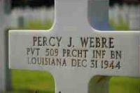 Pvt Percy J. Webre would go to battle in the European Theatre of Operations and fought in Southern France during operation Dragoon and in the Belgian Ardennes. Percy got wounded in action during the battle for Sadzot, a small town near Erezée, Belgium, on 28 December 1944, during the Battle of the Bulge.Source of information: Astrid van Erp, Carla Mans, www.wwiimemorial.com, www.archives.gov, www.ancestry.com - Headstone and Interment Record / 1930/1940 Census / U.S. WWII Draft Cards Young Men, www.battleofbest.com