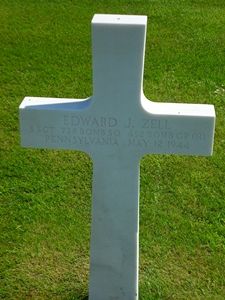 Edward Zell was last seen pinned under the landing gear. The tire on that landing gear was burning as was the whole right wing. It was believed that he was probably killed instantaneously. He was initially buried at the cemetery of Rudersdorf, District Siegen on May 13, 1944 at 1630 hours in Section 7, 3rd Row, Grave 2.