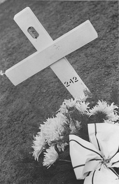 "On the above mentioned date, your son volunteered to go back to the Company kitchen to obtain hot food for the members of Company "D", who had participated in the day's fighting. About dusk he accomplished his mission and it was while returning the equipment back to the kitchen that he took a different route and in the darkness did not see the mine field that had been laid for protection against enemy counter attack. He was mortally wounded when the vehicle in which he was riding struck a mine."