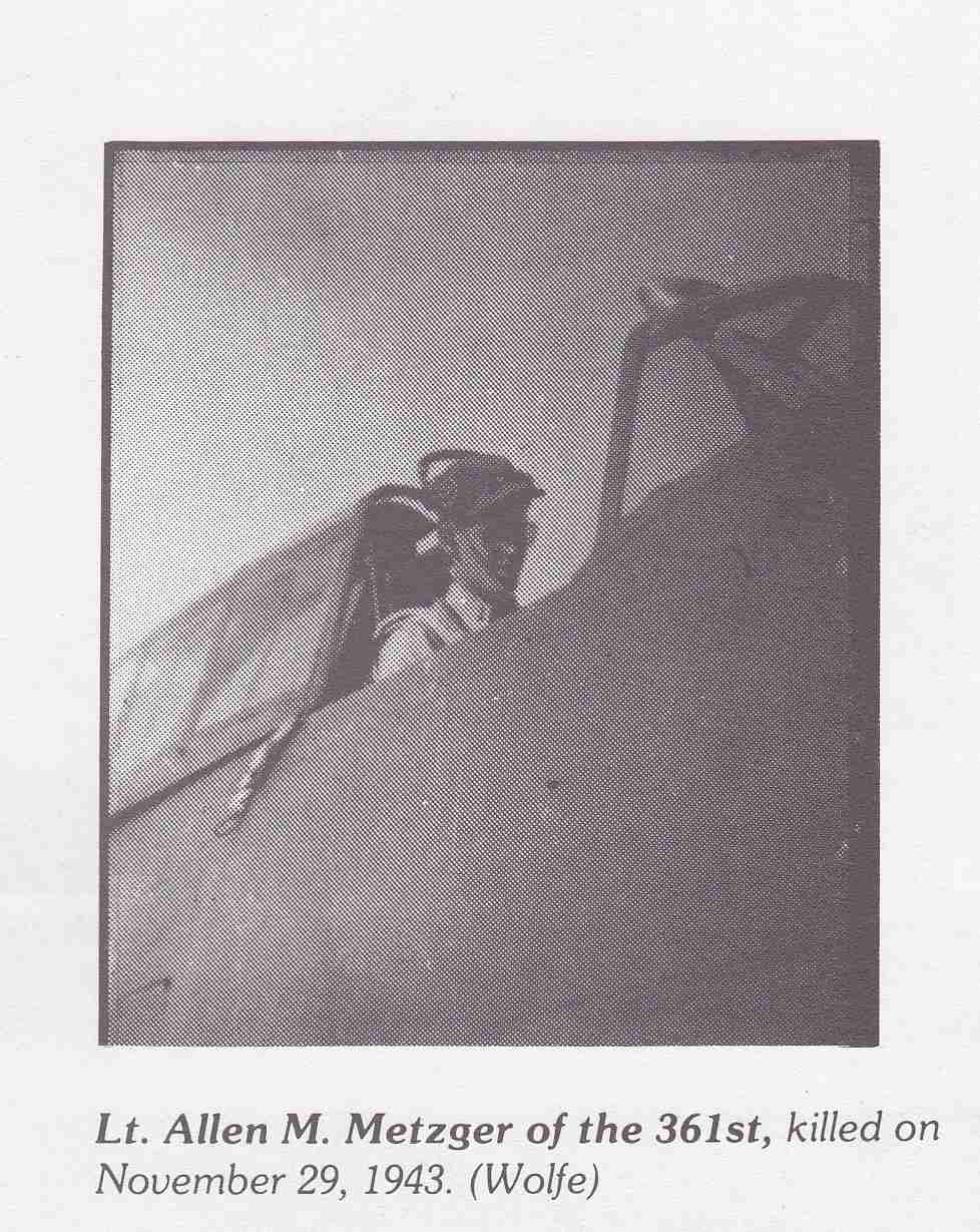 Statement of 2nd Lt Elmer G. Dendle, who flew in the same mission: "I was flying Blue four, Lt Metzger flying Blue 3 on the mission of 29 November. Just as we were making R/V with the bombers, we saw a lone ME 109 coming up on the rear of the first box of bombers. We were then at about 30,000 feet. Lt Metzger made a sharp right diving turn to the rear of the enemy aircraft. I followed. Lt Metzger closed in and fired. We were then at 25,000 feet and indicating over 300 MPH. When we reached 22,000 feet, I first saw Lt Metzger's strikes on the ME 109: numerous strikes along both wing roots. I continued to see strikes until ME 109 seemed to break away at about 15,000 feet in an uncontrollable spiral to the right with smoke trailing. Lt Metzger then made a violent left turn and I went past him. I looked around for Lt Metzger and couldn't see him because of the haze. I then climbed up to 27,000 feet and tacked on with our squadron just as it was leaving the bombers. There was an overcast from 25,000 feet to 15,000 feet. I didn't fire my guns during Lt Metzger's combat with the ME 109, but I believe that Lt Metzger destroyed one ME 109. This was the last seen of Lt Metzger."