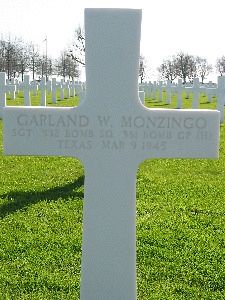 Sgt Garland W. Monzingo attended Stamford High School and was married to Maurine Walker on 25 March 1938. He was employed by the Johnson Motor Lines.He enlisted in Lubbock, Texas on 13 September 1943 and was an instructor at Las Vegas Air Base before he was sent overseas.