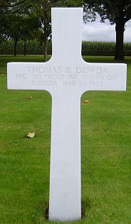 Pfc Thomas B. Dowda enlisted at Fort McPherson, Atlanta, Georgia on 23 May 1944.He was a passenger of C-46D #44-77595, which was shot down by anti-aircraft fire on the aproach to the dropzone and exploded when hitting the ground.