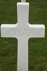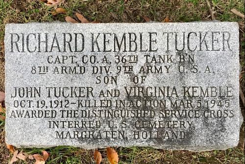 He was awarded the Distinguished Service Cross posthumously stated: For extraordinary heroism in connection with military operations against an armed enemy while serving as Commanding Officer, Company A, 36th Tank Battalion, 8th Armored Division, in action against enemy forces on 5 March 1945, in Germany. Captain Tucker displayed outstanding tactical skill and fearless leadership in the attack on an enemy town. With complete disregard for his personal safety, Captain Tucker, while under constant heavy enemy fire, courageously led the assault on strongly fortified enemy positions. He was forced to change tanks twice when they were disabled by enemy fire as he was leading the attack. Upon dismounting from the second knocked out tank Captain Tucker was killed by enemy small arms fire. The men of his command, inspired by this outstanding exhibition of bravery and daring, continued the attack and successfully achieved their objective. The intrepidity, fortitude, initiative and loyalty demonstrated by this courageous officer in the performance of his duty exemplify the highest traditions of the military forces of the United States and reflect great credit upon himself, the 8th Armored Division, and the United States Army.
