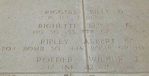 Albert G. Ripley graduated Geneva High School 1939 and Alfred University 1941.This aircraft B-24J, 42-99942 dropped out of the Group formation into a shallow dive, leveled off again about 7000 feet below former position in formation apparently under control. Up to this time no chutes were seen to come from the plane. After above events the ship was lost to view and no further reports were received regarding the ship.