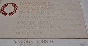 On the evening of 24 September 1944 Pvt Spector went into position with his platoon in the vicinity of Mook. The following morning his company received a very heavy enemy attack which partially over-ran their positions. On the afternoon of the 25th, he received a severe head wound when he was struck by shrapnel during an artillery barrage. First aid was immediately rendered. At that time the German forces attacked their positions and it was necessary for the company to withdraw to secondary positions. At that moment, Pvt Spector was unconscious and it was impossible to remove him in the withdrawal and his comrades were forced to leave him in a fox hole. Due to the nature of his wound, company members were of the opinion that he died while occupying the fox hole. Pfc Rene B. Forcier stated that he was dead when the doctor arrived at the foxhole to which he had been removed. the company never regained their former positions and five days later they were relieved by A Company.