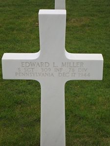 S/Sgt Edward L. Miller enlisted in Harrisburg, Pennsylvania on 13 March 1943. He attended Lebanon High School in Lebanon, Penssylvania.In a letter to his family on 10 June 1946, C.B. Davison, told what happened that day. His company had moved in Kesternich and was holding his position in the houses. At a certain time, they noticed that everybody had moved and their platoon was left behind with no food or help. S/Sgt Miller, together with S/Sgt Joseph B. Wadman from B Company, who is also buried at Margraten, decided to go back through the town and find the rest of the company. At that time it was already night. It was the last time they saw them.