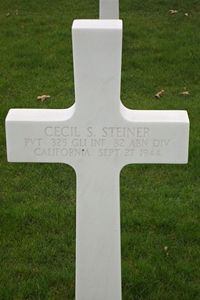 Pvt Cecil S. Steiner enlisted in Los Angeles, California on 12 January 1944.Pvt Cecil Steiner was on a mission with his company to attack enemy positions in the Kiekberg near Groesbeek. The company was subjected to machine gun and mortar fire during which Steiner was hit by small arms fire.