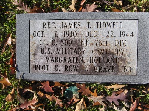 Pfc James T. Tidwell enlisted in Jackson, Mississippi on 5 September 1940.He is remembered at the Harlands Creek Cemetery in Coxburg, Holmes County, Mississippi.