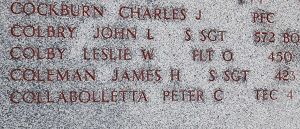 James Coleman was employed by a hardware firm in Greencastle, Indiana.His wife learned, just a week after the birth of their daughter, that her husband was believed lost on his 15th raid over Europe. He had been overseas for seven months.