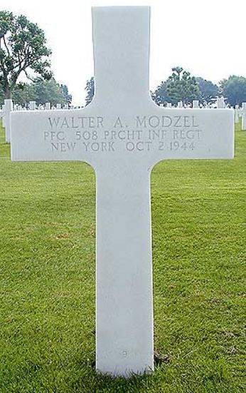 Pfc Walter A. Modzel enlisted in Rochester, New York on 24 November 1941 and was transferred to a paratrooper unit in 1943. He attended Benjamin Franklin High School and went overseas in May, 1944.He was first buried at American War Cemetery Molenhoek, the Netherlands on 2 October 1944, B-8-155.