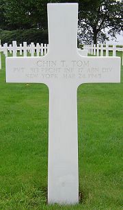Pvt Chin T. Tom enlisted at Fort Jay, New York on 1 October 1942.He was killed while he was decending on his parachute.