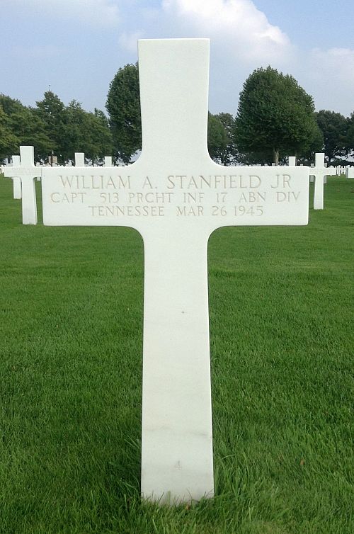 On 26 March, the company moved into the attack across a German Superhighway near Wesel, Germany. They moved off, and one platoon was pinned down by fire of German weapons. Some tanks came up and the platoon moved behind the tanks. Lt Arhtur Millman took charge of one group behind a tank and Captain Stanfield took another. They moved off in the face of machine gun, mortar and German bazooka fire. They crossed the superhighway and then crossed an open field. Captain Stanfield was hit and killed instantly.Source of information: Tom Verheijden, www.abmc.gov, https://etvma.org/veterans/william-a-stanfield-jr-7420/, www.ancestry.com - Headstone Inscription and Interment Record / Family Trees / 1930 Census