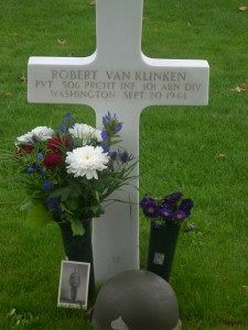 Pfc Robert Van Klinken enlisted at Fort Lewis, Washington in August 1942. He received infantry training at Camp Toccoa, Georgia and parachute qualification at Ford Benning, Georgia. He was sent to England in September 1943 and on 6 June 1944 parachuted into Normandy where he was reported wounded in action a few days later. He recovered in England and rejoined Easy Company to participate in Operation Market Garden on 17 September 1944.He was killed by machine gun fire when he ran forward with a bazooka to attack German tanks.