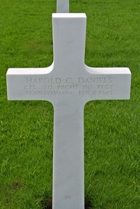 Harold C. Daniels was sent overseas on 2 June 1943 with the U.S. Medical Corps. He transferred to the paratroopers while overseas. He first saw service in Africa and Italy.He was awarded the Silver Star Medal posthumously awarded for gallantry in action during operations against the fixed fortifications of the Roco Reveo defenses near Bergstein, Germany, the platoon, to which Cpl Daniels was attached, moved across the open ground when an enemy flare was fired, followed by the firing of machine guns fifty yards away. Corporal Daniels attended three wounded men in full light from illuminating flares during this time. Wounded by mortar fire, he nevertheless carried several wounded men to cover. Due to heavy casualties the company was ordered to withdraw. Cpl Daniels saw many wounded men abandoned. He procured a supply of morphine and voluntarily returned to the field in face of intense enemy barrage, and gave aid to the wounded until he himself was killed by a mortar shell.
