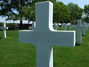 Plane 43-37834, flown by Lt Fred J. Lockwood, was hit by fighters just moments after turning on the IP. Details of what exactly happened to these planes on this attack are scarce. The attack lasted 13 minutes. There were about 50 ME-109s and FW-190s that hit from below at six and nine o'clock. The damage was done by 30 mm shells and this plane, along with four others in the Squadron, left the formation and crashed in Germany. Two of the crew were killed, the rest became POWs.Joe was listed MIA until the war was over. At that point records of his burial by the Germans were obtained, and his remains were interred at Margraten cemetery, the Netherlands. His name is inscribed on page 214 of the Roll of Honour maintained at St. Paul's Cathedral in London, England.