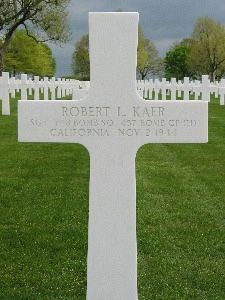 Sgt Robert L. Kaer attended Polytechnic High School in Riverside, California.Approximately 40 enemy aircraft bounced group at about 1248 to 1258, 17 to 27 minutes after bombs away, in area between coordinates 5135-11252 to 5110-1110. They attacked from the tail between 5 and 8 o'clock. They approached in waves, but each of them appeared to single out an individual B-17 to attack. The Aircraft was hit by enemy aircraft and pulled off to the left, was flying straight and level when last noticed. The aircraft was flying number 3, low section, low squadron. This was one of seven aircraft shot down from this squadron.