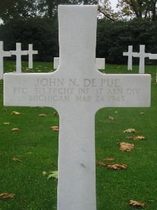 Pfc John W. De Pue was employed by Pontiac Motors before he entered the army.He was killed by a sniper right after he landed with his parachute on the dropzone.