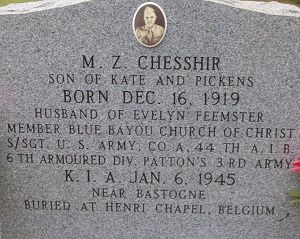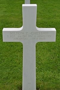 S/Sgt Milton Z. Chesshir enlisted in Little Rock, Arkansas on 11 January 1944. He was killed in action near Bastogne, Belgium during a battle with the 12th SS Panzer Division. The last attempt by the Germans to seize Bastogne.According to the data in the IDPF, he was killed by artillery or mortar fire (mandible and left humerus fractered, crushed skull).