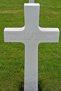 Pvt Donald A. Gustafson graduated from Port Allegany High School with the class of 1941 andwas employed in the Pittsburgh Corning factory.He enlisted in Erie, Pennsylvania on 13 February 1943 and was sent overseas in September 1944.