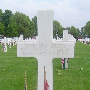 Sgt Edwin B. Booth graduated from Westwood High School and completed two terms at Harvard.He enlisted in Boston, Massachusetts on 12 July 1943. He trained at Fort Benning and Camp Forrest and was promoted to sergeant in January 1945. Later that month he was wounded in action in Belgium, but returned to the front.
