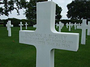 F/O Benjamin J. Bushey grew up in Hampden County, Massachusetts. He loved the family dog Ginger, played sports, ran track in high school and was interested in aviation. His father was a math teacher and ran a club in school for students interested in airplanes. Benjamin and his brother Donald were members of that club. Right after he graduated from high school in 1943, he enlisted in the U.S. Army Air Corps. He was sent to the University of Cincinnati to take classes in English and French, which he found pretty tough, but he mainly liked the math classes. He studied hard and was qualified to be a pilot but decided he would rather navigate an airplane. After this, he was sent to airbases in Louisiana and Texas for flight training to prepare to be sent over to England. During this time, he missed his family and girlfriend very much. In November 1944, he went home to see his family and say goodbye, because he would be shipping out just after Christmas. That was his last visit home. In December, he sailed to England, where he was stationed in Peterborough. This was where he trained with his flight crew. He spent January 1945 in training exercises and began real flights and missions in February. In March of 1945 he learned that he would be promoted to captain for his service so far. Unfortunately, he never got his captain bars.His aircraft was apparently hit directly by a shell, which did not burst on contact. About 8 or 9 feet of the right wing was cut off. There was a flash where the flak hit but no fire visible thereafter. After being hit, the aircraft peeled to the right, turned over on its back and went down out of control. It was in a sort of spin. It appeared to break apart at the wings, the fuselage separating from the wings. When it was last seen, the wings were still in a sort of spin. The aircraft was not seen to catch on fire.