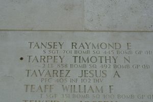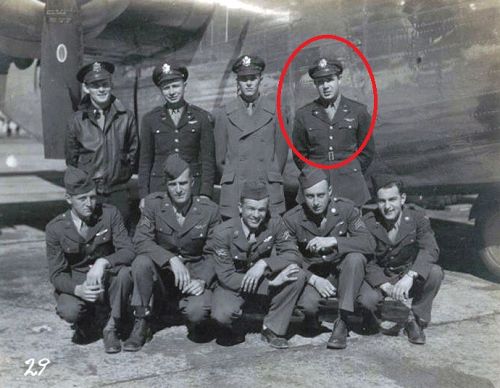 2nd Lt Timothy N. Tarpey graduated from Passaic High School and was a clerk.The aircraft was attacked by approximately 50 enemy aircraft, ME-109's and FW-190's, in the Hannover area. The plane dropped out of formation and 8 chutes were seen to open. The aircraft was seen to go down through the undercast still under control. In contrast with the testimony that 8 chutes were seen, the entire crew was lost in the crash. The bodies of George F. Guy, Vincent Kalata, Marshall W. Johnson, Laurence H. Nursall (this is probably wrong, because his body was later recovered at the crash site, it is most likely that this is Louis W. Brooks) and one unidentified body were buried at the Jewish Cemetery of Hoya/Weser on 21 May 1944. After the war the bodies of Kalata and Joe C. Powell Jr. (probably the unidentified body) were reburied at Ardennes American Military Cemetery.