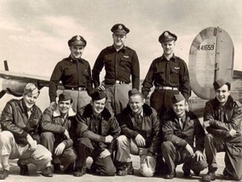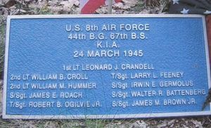 William Hummer is not in the group photo. On 24 March 1945, William Hummer substituted for Navigator Bertil Carlberg, the man mid back on the picture. He is the only man in the photo who survived the war.