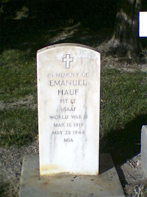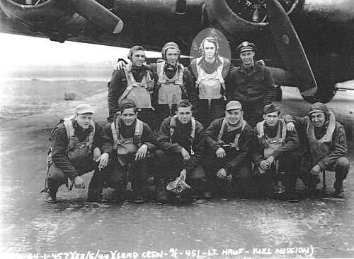 "The airplane made it to Leipzig undamaged. On the bomb run and turning away from the secondary target, we encountered moderate flak. Lt. Hauf's plane was seen to receive a near burst of flak which left his right wing on fire between the #4 engine and the wing tip. The fire soon went out and he was able to stay in formation. The damage to the wing was very noticeable to us as it was on the leading edge of the wing and on top. From Leipzig to Brussels, the fire was seen to smoulder at times. One body was seen leave the airplane after the flak burst. At Brussels, Lt. Hauf was seen to start lagging behind the formation and start to lose altitude. The airplane was going to a lower altitude very rapidly and the fire seemed to spread across the wing and fuselage. The right wing broke away and the ship went into a violent spin and blew up before hitting the water."