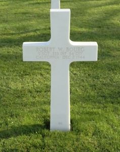 S/Sgt Robert W. Bourg attended high school for four years and was employed at Douglas Aircraft. He enlisted in Los Angeles, California on 12 December 1942."Company's E, F, G & H to the high ground northeast of Lindern. Late in the afternoon we jumped off and in a very short time under cover of marching fire Co. E was in position. It was not to last. Lindern was situated in very flat terrain exposed to artillery, mortars machine gun, and small arms fire. Almost immediately, E Company was submerged into the hottest piece of real estate it had ever experienced before and for the longest time. (Prummern was a close second, but it did not last as long). Fire coming from Linnich, Brachelen was constant and ferocious. My squad leader Sgt. Bourg's body was riddled with shrapnel after warning me to spread further out from his position."
