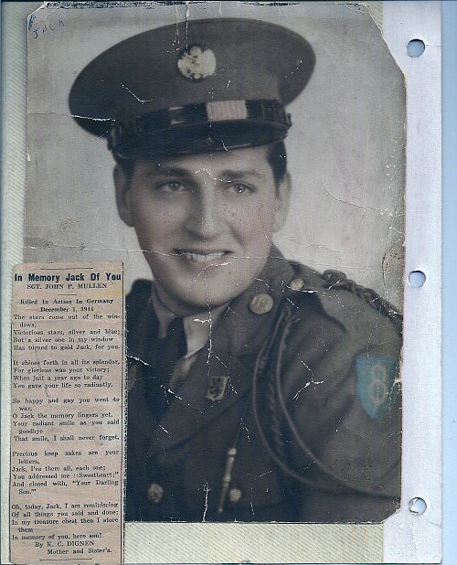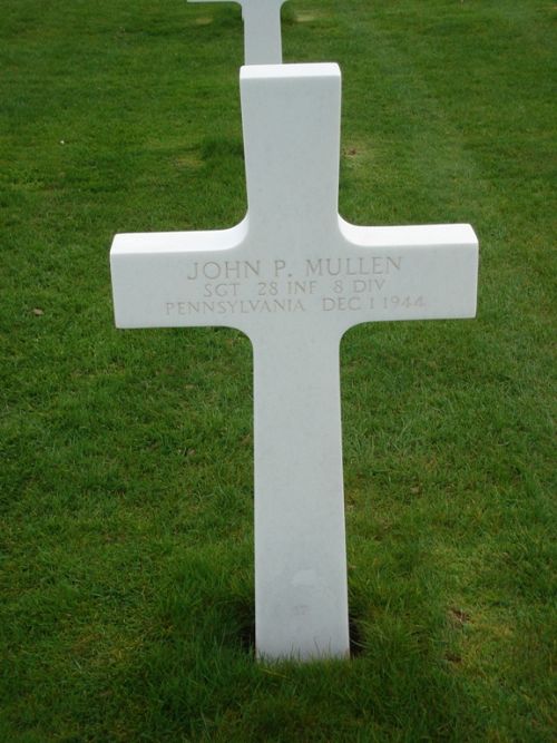 Sgt John P. Mullen enlisted in Camp Lee, Virginia on 22 July 1941. He arrived in Europe on 5 July 1944.He was awarded the Bronze Star for heroic action in France in July 1944, when he helped to evacuate wounded comrade.