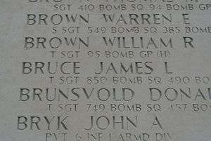 T/Sgt James L. Bruce attended Corpus Christi High School and was employed at Chapman Lumber Company.The airplane left formation after bombs away and was hit by fighters and flak. The crew was reported to have bailed out. No word was received from any crew member.