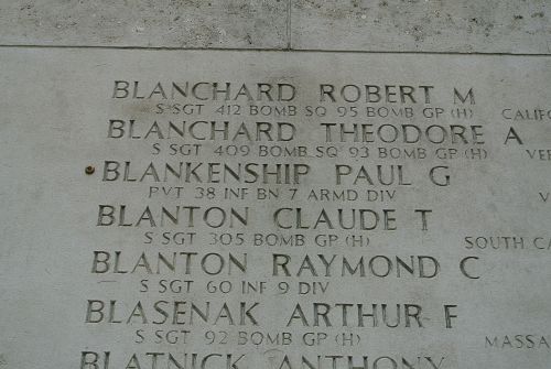 The mission at that time was to clear te wooded area surrounding the town of St. Antonis. During this mission the company encountered enemy forces and was greatly scattered. When a physical check was made, the company found to have suffered many losses. It was assumed that the missing men had been either killed or captured by the enemy. Du to the tactical situation na search could be made at that time.In November 1959, while installing a drainage ditch, the remains of Pvt Blankenship were found near a building on the farm "Het Klaverblad" Found with the remains were items of clothing and equipment and two identification tags.