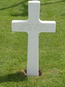 S/Sgt John T. Blake was taken prisoner in the vicinity of Schlausenbach, Germany on 16 December 1944.He died in Stalag XII-A during a British night air raid. The intended target was the railway station in Diez, but some flares, dropped by the pathfinder aircraft, drifted off course in a strong wind and strayed into the POW camp. The bombs of RAF Mosquitos did not miss the highlighted target of a concrete building, housing mostly medical personnel.