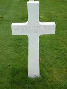 Pvt Ralph R. Thompson was a very serious person and always had some type of money-making idea. He had just finished high school and was attending college at night when he was drafted. He was 18 years old and only had a weekend pass before he went to Europe. His parents had fourteen children: Ten boys and four girls. Six brothers were in the service during WWII.His brother Robert is buried at Plot H, Row 12, Grave 2. Ralph and Robert were killed within a few weeks of each other.