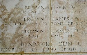In 1947, a German civilian stated that she discovered the remains of a US airman in de Vallendar forest region, who was covered by a parachute that had failed to open entirely. An identification tag found with the remains bore the inscription "Brown James P." The identification tag and papers of the deceased were removed, and after a lapse of time of one or more days, the site was again visited. The remains were left, supposedly, for disposition by the German military, but since that time, no trace of the remains has been found.
