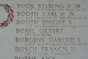 Pfc Gilbert Borel worked in a sawmill. He enlisted in Lafayette, Louisiana on 23 December 1942.He was killed when the tank destroyer of which he was an occupant was struck by an enemy Panzerfaust. Also Cpl David Paiz, who is also buried at Margraten, was killed. Sgt Walter S. Clark, who was also a crew member was wounded and died two days later. He is also buried at Margraten.